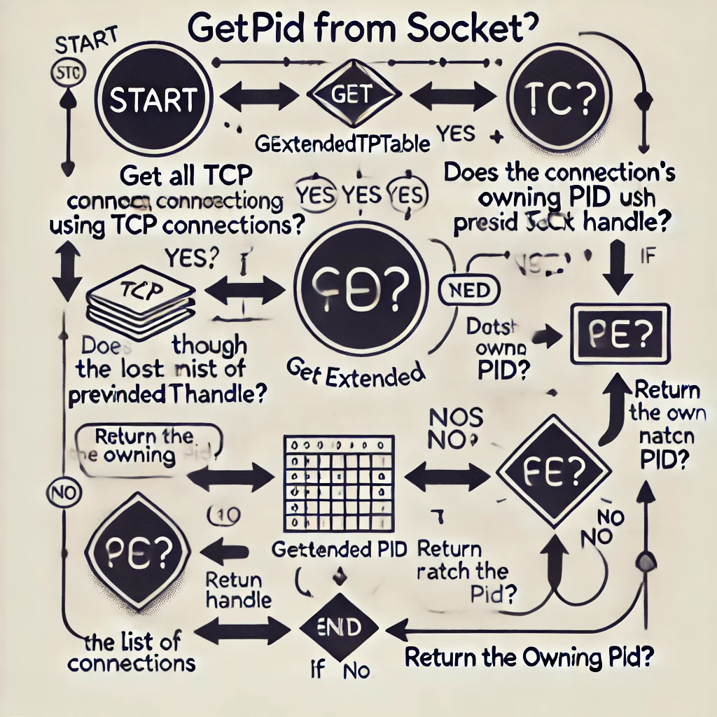 Windows API를 사용하여 특정 소켓에 대한 소켓 ID(SOCKET 또는 소켓 핸들)에서 해당 프로세스 ID(PID)를 찾는 방법에 대해 설명하겠습니다.